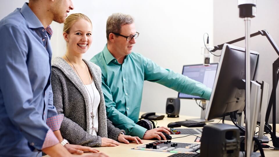 - Praxisorientiertes Lernen: Das Studium ist geprägt von Praxisphasen, Praktika und Projekten mit bekannten Partnerunternehmen. Das Equipment ist auf dem modernsten Stand – vom Foto-, Radio-, TV- oder Green-Screen-Studio bis zum Game Lab.